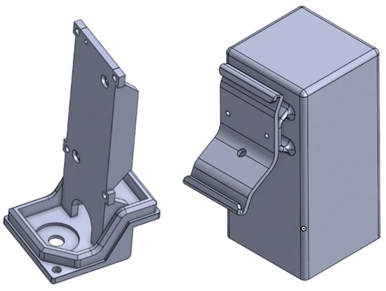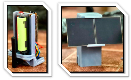 The sensor nodes used in this research went through several successive iterations, with each improving on the last. The latest version was referred to as V4, and it is the one referred to in this article. The V4 sensor node enclosure is a vertical, 3D-printed housing. It is composed of three main parts: the base, the cover, and the attached solar panel mount. Figure 3 presents the base section of the enclosure (left) and outer cover with the solar panel mount attached (right). The solar panel mount is a simple, clamp-like part that the two solar panels slide into side by side.