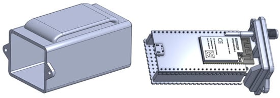 The drone node case is made up of two separate parts. The first part is the base on which the electronics are mounted, and the second is the outer casing that protects the node’s circuitry. The base part houses various components, such as the microcontroller board and a Wi-Fi module, with an opening for the antenna. The CAD drawings in Figure 5 show the base with electronics and the upper casing.