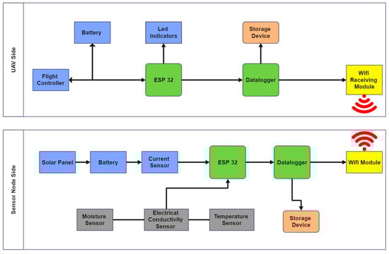The electronics assembly consists of multiple electronic components that work alongside each other to create a system that effectively collects and transmits sensor data. When the sensor nodes detect the drone in their proximity, they begin the process of transmitting data to the drone node, which is ready to receive and store the data. Figure 7 shows a diagram of both the drone node (top) and sensor node (bottom) electronic components and their relation to one another.