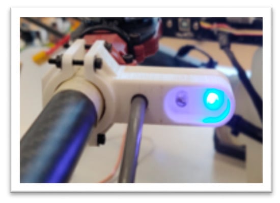 To test the system, the hexacopter was fitted with a simple 3D-printed pilot indicator with LEDs that can be used to notify the pilot of the drone node’s current connection status. A flashing light indicates a connection is in progress, while a solid light indicates that the connection was successful as seen in Figure 8. A red light is used to indicate that an error has occurred in the case of an unsuccessful connection.