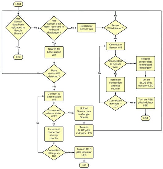 Figure 9 details the internal logical process followed by the drone node software in attempting to connect to the sensor on the ground. The code was implemented using the Arduino IDE, but a generalized representation is shown here. The system attempts to connect the sensor nodes and then stores the data and uploads them via Google Sheets integration.
