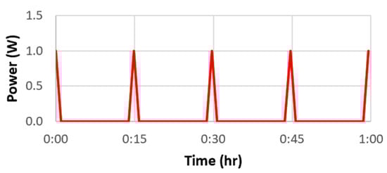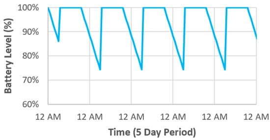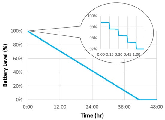Note that the power consumption is never exactly zero, just very low (1.6 × 10−5 W). If one were to assume no solar charging whatsoever and a relatively linear discharge rate, the waking/sleeping cycle of the sensor node would, in theory, allow the device to continue collecting data for about 42 h, declining slowly and then steeply once every 15 min due to the stress of the active state. This behavior is demonstrated in Figure 11.