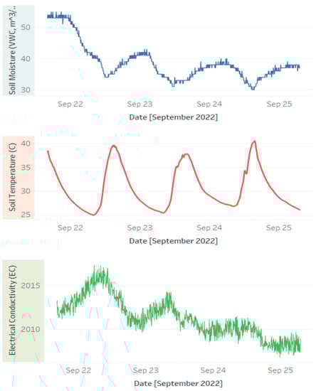 On multiple occasions, the sensor node was deployed in a farm field to record soil data over a number of days; then, the data were retrieved. The types of values recorded included soil moisture (volumetric water content), soil temperature (in Celsius), and electrical conductivity (EC). The graphs in Figure 15 shows examples of each of the kinds of data recorded over the time period in a given deployment. These types of data are representative of information that is valuable to farmers making irrigation management decisions.
