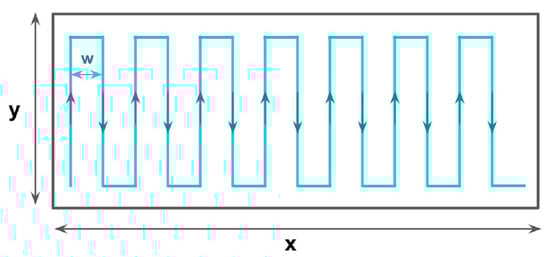Typical flight path of UAV equipped with imaging technology (y is width, x is length, and w is horizontal length). Arrows show the direction of the flight.