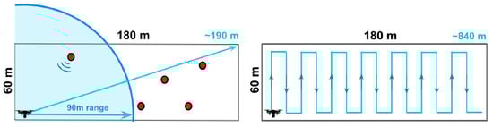 where D is the total distance, a and b are the width and length, and h is the horizontal width of the grid, which varies depending on various factors related to the equipment used, such as the field of view and resolution. Based on previous work, in the case of the OptRx sensor, a suitable width is 10 m, whereas for the Ximea camera, it is 18 m []. Therefore, we can calculate the total distance that would need to be traveled for a field of our size (60 m × 180 m):