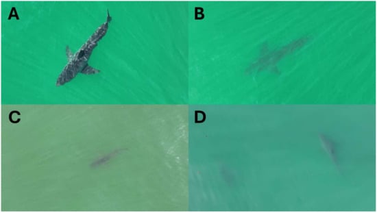 Examples of sharks at varying depths from the surface and under varying conditions. (A) indicates a shark at the surface, with favorable body posture and environmental conditions for measurement. (B) depicts the same shark under the same environmental conditions at depth, where the caudal fin is nearly invisible. (C) depicts a shark in turbid waters, where despite being close to the surface, it is hard to see the complete silhouette. (D) depicts the effects of turbid water and depth. One shark may or may not be close to the surface but turbid waters show it is unclear how deep the shark is. The second shark is nearly invisible due to depth and turbid water.