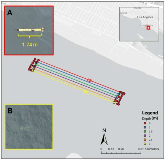 Data were collected offshore of Belmont Shore, Long Beach California, United States of America (33.747934319183, −118.132995506648) from 09:15 to 10:30 on 5 September 2023 (Figure 2) known as a former juvenile white shark aggregation site []. Wind speed was light, 1.3 m/s (NOAA meteorological weather buoy 9,410,665 J, Los Angeles Pier, California, 33.733164, −118.185491, 6 min resolution) so there was little to no wind chop. Belmont Shore is protected by large jetties due to its proximity to the Los Angeles Harbor so there was no swell during field data collection. Cloud cover was 99.2%, with 22.9 km of visibility (Visual Crossing Weather Data []). We conducted this study during the calmest and clearest possible conditions to determine the error during the best possible visibility for measurement conditions.