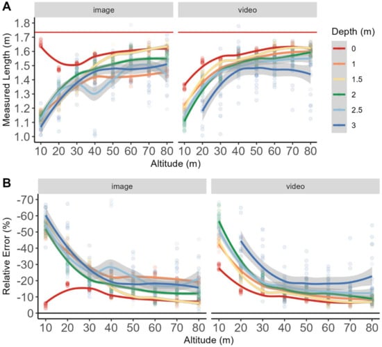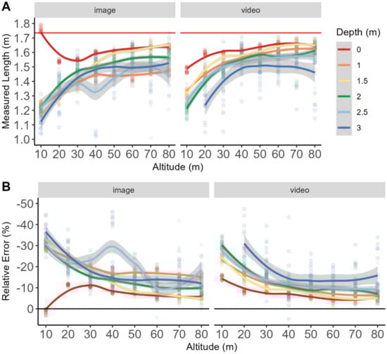 Loess spline modeled measurement accuracy for both images and video for all raw data. (A) shows the raw measurements compared to the actual length of the AUV, indicated by the red line at 1.74 m across all depths. Raw data are shown as points. (B) depicts the relative error of each measurement to compare the accuracy of each measurement across all depths. All measurements were underestimations so relative error is negative.