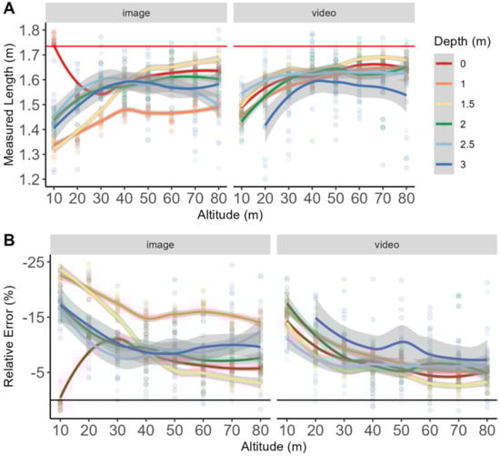 Loess spline modeled measurement accuracy for both images and videos for data where the boat’s bow height was added to the UAV’s altitude to generate the GSD. (A) shows the raw measurements compared to the true length of the AUV, indicated by the red line at 1.74 m across all depths. Raw data are shown as points. (B) depicts the relative error of each measurement to compare the accuracy of each measurement across all depths.