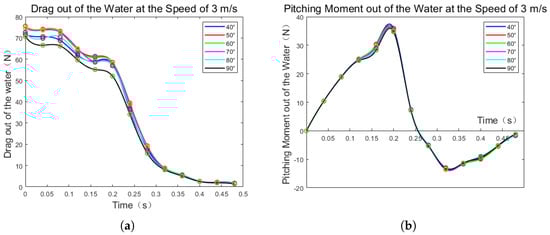 The drag force and pitching moment of the vehicle during water exit are illustrated in Figure 21. It is evident from the figure that both the drag force and pitching moment show limited sensitivity to changes in the water exit angle but are significantly affected by the vehicle’s speed. At a velocity of 3 m/s, the maximum drag force is approximately 75 N, and the maximum pitching moment is around 38 N·m. As the speed increases to 4 m/s, both the maximum drag force and pitching moment rise substantially, reaching about 130 N and 70 N·m, respectively. Notably, the curves of drag force and pitching moment versus time exhibit consistency across different speeds.