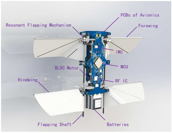 As shown in Figure 1, the HiFly-Dragon adopts a tandem wing configuration to mimic the flight behaviors of dragonflies. The prototype consists of four main components: the flapping driving mechanisms, the PCBs of the on-bard avionics, four wings, and the batteries. Instead of the complex multilink-based flapping driving mechanisms [,,,,], the flapping robot was directly driven by four resonant mechanisms, and all sub-systems were integrated between PCBs for size and weight reduction. It has been verified on a twin-winged direct-driven robot [] that multi-DOF of vehicle motion and feedback control for attitude can be achieved by the cycle-averaged forces and torques generated by modulating the wing beat velocity within a single flapping cycle without additional actuators or mechanisms.