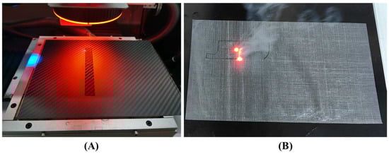 The wing membrane was strengthened by the veins to amplify the aerodynamic performance. The veins were made of a 0.4 mm thick carbon fiber board and cut into 0.6 mm wide ribbons by an ultraviolet picosecond laser (HGTECH, LSP30), as shown in Figure 3. The wing membrane was made of cuben fiber (a laminated high-performance light-weight nonwoven fabric constructed from Ultra High Molecular Weight Polyethylene (UHMWPE, Dyneema, Ohio, USA) fiber monofilaments and polyester), which has great mechanical properties of strength and durability to address the alternating impact load conditions during flapping. The outlines of the wing membrane were automatically cut by a CO2 laser with a high-speed scanning galvanometer (ZK-50W, Zhengke Laser Equipment, Liaocheng, China). Compared to the processing of hand cutting [], the proposed automatic processing method holds significant advantages in terms of consistency and manufacturing efficiency.