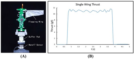 Considering the limited onboard power supply, the prototype demands high propulsion efficiency to generate sufficient thrust while consuming less power. To address that, the trapezoidal airfoil in [] was adopted to improve the aerodynamic performance with a wing length of and a mean chord length of . The wings can be driven to flap at a natural frequency with the proper gains of the motor controllers, so that the aerodynamic lift can be tested. As shown in Figure 4, the mean lift of the wing was measured by the F/T sensor (Nano-17, ATI Industrial Automation, North Carolina, USA), indicating that the flapping wing generated a maximum thrust of 11 gf while flapping at a frequency of 28 Hz and an amplitude of about 190°. The power consumption during the measurement was recorded at 0.49 A × 11.1 V = 5.439 Watts with a programmable DC power supply (DP811, RIGOL, Suzhou, China).