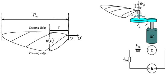 To actuate the resonant, direct-driven flapping wing mechanisms, the aerodynamics and mechanical resonance of the flapping wing actuation system have been extensively studied [,,,,]. The conceptual design of the flapping wing system is illustrated in Figure 5, in which the flapping wing system has two degrees of freedom of motion: wing stroke angle and passive wing rotation angle . The model of the flapping wing system is simplified by the quasi-steady aerodynamics assumption with Blade Element Theory (BET), and according to [], the equation of motion for the system can be given by