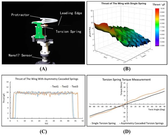 Photograph of the experimental setup for torsion spring elastic coefficient measurement (A). The thrust tests of the resonant driving system with a single torsion spring (B). The thrust tests of the resonant driving system with asymmetric cascaded torsion springs (C). Curves of the torsion spring torques with respect to the torsion angles (D).