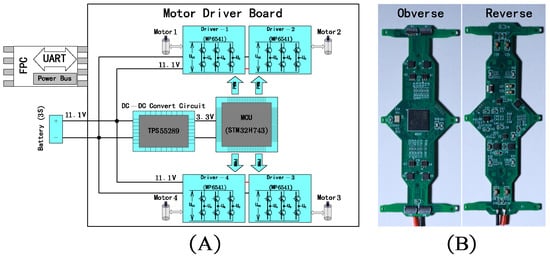 Schematic of the latest onboard motor control board (A). The frame of the PCB board was designed in the shape of the airframes to mount the mechanical structures (B).