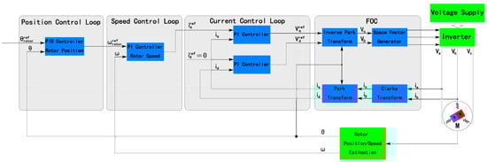 where , , and are the gains of the position controller. By setting the control output of the position controller as the reference of the speed controller, the error in the speed control loop can be obtained by