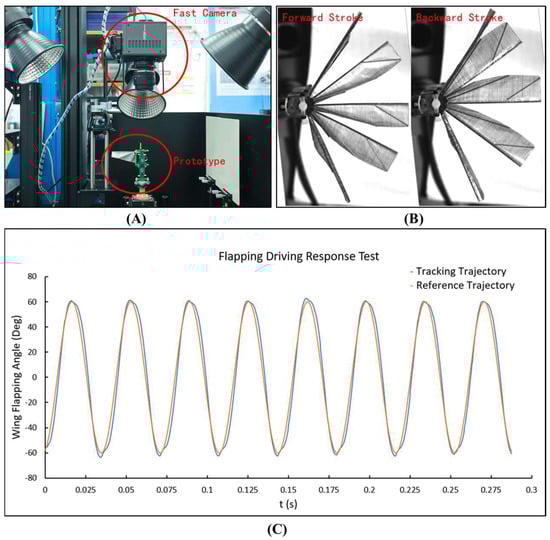 The motor control loop was implemented at the MCU embedded on the motor driver board at a rate of 2 kHz. The flapping driving system was tested to actuate the flexible wing to flap at a frequency of 28 Hz with an amplitude varying from 100° to 190°. As shown in Figure 10, the wing kinematics were verified to flap at a frequency of 28 Hz and an amplitude of 120° with a head high-speed camera (FASTCAM UX100, resolution 1280 × 1024 pixels, Photron, Tokyo, Japan) at 4000 fps. The flapping angles were measured using Photron PFV4 software, demonstrating that the wing flapping actuation system is able to track the preset flapping trajectories well. The proposed closed-loop flapping actuating control approach based on cascaded PID controllers and the FOC method achieves a larger amplitude and less phase lag compared to the LQR controller and sine wave control approach in [].