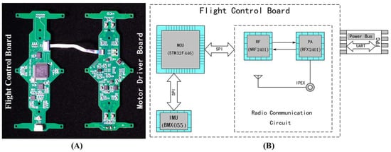 The two avionics PCBs were connected with a flexible printed circuit (FPC) cable for power supply and communication (A). Schematic of the flight control board (B).