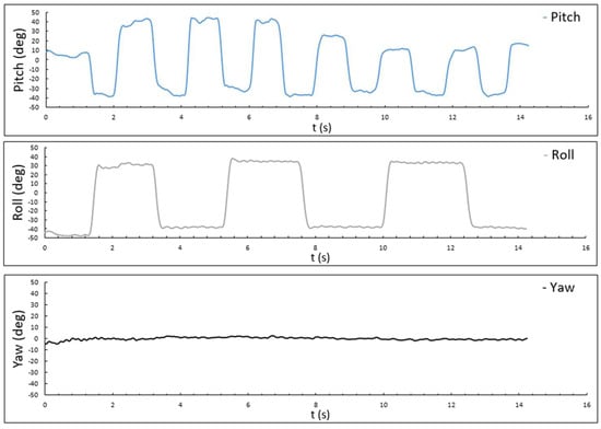 Euler angle of robot attitude estimated by the ESKF method. The prototype was tilted by hand to verify the response of the sensor fusion algorithm, with the four wings flapping at a frequency of 28 Hz.