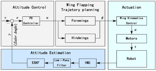 Suffering from the severe instantaneous oscillations produced by the flapping driving system, developing an attitude estimation algorithm with sufficient accuracy, robustness, and rapidity for attitude estimation is a great challenge, especially with weight limitations preventing the employment of physical buffer materials to reduce noise. The accelerometer and gyroscope were sampled at a rate of 400 Hz. The raw data from the sensors was filtered by second-order Butterworth low-pass filters (400 Hz sample rate, 15 Hz cutoff frequency). Accelerometer signals were used to measure the roll and pitch angles. However, the accelerometers were strongly affected by vibrations caused by the flapping system. The signal noise of the accelerometers cannot be significantly filtered with a higher cutoff frequency (25 Hz) of the filter, resulting in attitude estimation divergence, while the extremely low cutoff frequency (25 Hz) causes nonnegligible hysteresis. To address that, we adopted the error-state Kalman filter (ESKF) method for sensor fusion. As shown in Figure 12, the proposed attitude estimation algorithm was implemented on the flight control board and demonstrated convergence and robustness.