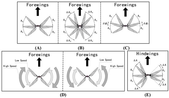Illustration of the parameters of the flapping motion. The flapping amplitude (A), the symmetric flapping amplitude changes of the forewings for lift control (B), the flapping amplitude offset of the forewings for pitch torque generation (C), the anti-symmetric stroke velocities of forward stroke and backward stroke in a flapping cycle for yaw torque generation (D), the asymmetric flapping amplitude changes of the hindwings for roll torque generation (E).