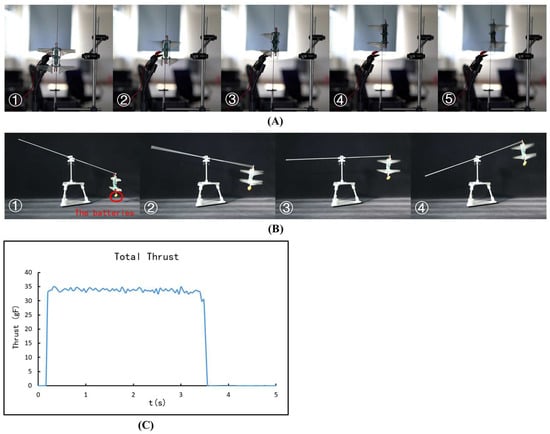 Tracked flight experiments were designed and implemented to verify whether the proposed resonant, direct-driven system can generate sufficient thrust to take off with onboard power. As shown in Figure 16, a carbon guide rod with a diameter of 4 mm was set to constrain the prototype’s attitude, maintaining an always vertically downward thrust vector, which is consistent with the hovering flight mod. Then, the prototype was installed on the guide rod and powered by an external power supply, and the prototype (not including the batteries, weighing 25.417 g) succeeded in taking off with an amplitude of 150° at the natural frequency of 28 Hz. The batteries were verified to be able to discharge at a constant power of 11.1 V-2 A for more than 27 s using a comprehensive battery tester (JK5530B). During the tracked flight test, the wings were actuated to flap at the take-off amplitude of 168° at 28 Hz powered by onboard batteries, and the total lift of the robot was measured to be over 34 gf with the Nano-17, which is larger than the latest prototype’s 32.97 gf self-gravity. The total take-off power consumption was 1.33 A × 11.1 V = 14.763 W, including the power consumption of the flight control and motor control systems. A balance beam was also used to test the propulsion capability of the robot. The prototype, weighing 32.97 g, took off tethered by the balance beam with all subsystems integrated, as the forewings and hindwings reached an amplitude of 170° at a frequency of 28 Hz.
