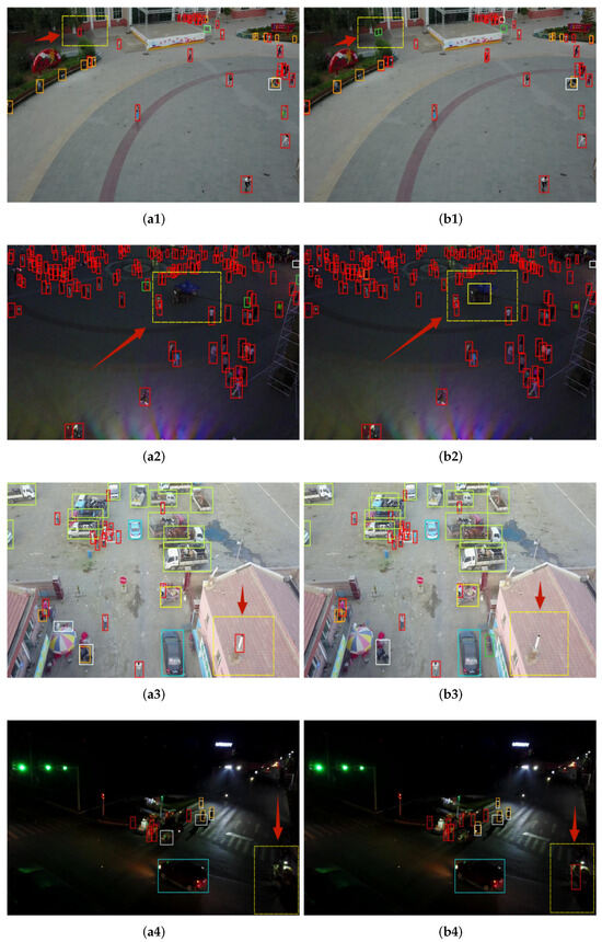 UAVs, also known as unmanned aerial vehicles, are widely used in remote sensing mapping [17], maritime emergency rescue [18], urban inspection [19], and other relevant fields due to their convenience of use and low cost. As shown in Figure 1, UAV images mainly have the following two features. First, due to the difference in the tilt angle of UAV shooting, the object size is large in areas near the UAV camera, while the object size is small in places far away from the UAV camera, resulting in large scale changes in objects within UAV aerial images. Secondly, due to differences in the positions and heights of UAVs, drone images often contain numerous small objects that are vulnerable to interference from complex backgrounds. Therefore, detecting objects in UAV images poses a significant challenge. Many excellent researchers are working to solve the difficulties of UAV object detection. Wu et al. [20] proposed a multi-branch parallel network that utilizes multi-branch up-sampling and down-sampling to reduce information loss when the size of a feature map changes. Wang et al. [21] added an ultra-lightweight subspace attention module (ULSAM) to a path aggregation network to highlight object features. Huang et al. [22] proposed a feature-guided enhancement (FGE) module that designs two nonlinear operators to learn discriminant information. Although these methods are effective for UAV image object detection, they ignore the importance of fine-grained information in shallow feature maps.