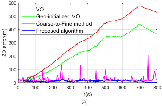 To evaluate the performance of our proposed algorithm, we compare it with various algorithms in the simulation dataset, including the VO algorithm (the monocular vision mode of ORB-SLAM3) [13], the VO algorithm after geographic initialization, the geolocation algorithm based on coarse-to-fine image matching [23], and our proposed algorithm. The 2D errors between the different algorithms and the ground-truth trajectory are depicted in Figure 7. The trajectory obtained from the VO algorithm is converted into the geographic coordinate through a similarity transformation matrix, which is derived using multiple ground truth poses by solving a least-squares problem [32].