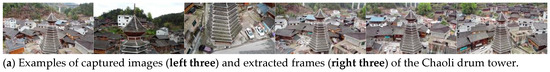 The data were acquired by a DJI AIR2s UAV with the following two data acquisition modes: (1) sequential video recording for overall survey and (2) unordered image capture for local observation, on four drum towers, named Chaoli, Congjiang, Zeli, and Zengchong. For video recording, a different number of flights with different flight heights are conducted on different scenes. In order to combine the video and image data for uniform 3D reconstruction of the drum towers, the recorded videos were further extracted to frames using FFmpeg, and the extraction rate is set to 1 frame per second (FPS) in this paper to make a tradeoff between computational efficiency and information fidelity. Examples of images and extracted video frames of the Chaoli, Congjiang, Zeli, and Zengchong drum towers are shown in Figure 8, and the associated metadata, including the number of captured images and extracted frames, average overlaps between adjacent images, ground sampling distances (GSDs), and flight heights of the acquired data on each drum tower is listed in Table 1.