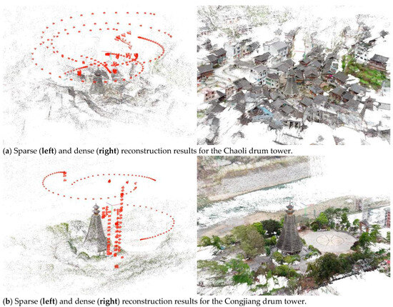 In Section 4, we detailed the construction techniques and procedures used to simulate and reconstruct the structural characteristics of the drum towers, resulting in an internal engineering model that accurately reflects the original construction methods. Section 5 covered the acquisition of external point cloud data through drone oblique photography and 2D imaging. By employing feature extraction, matching, and fusion techniques, we successfully achieved 3D reconstructions of four prominent drum towers: Chaoli, Zeli, Congjiang, and Zengchong. This study highlights two primary advantages of the proposed framework. First, it offers an effective solution for repair and reconstruction when historical records or construction drawings are unavailable, ensuring the preservation of endangered architectural heritage even in the absence of documentation. Second, the framework provides a reliable method for assessing and documenting inaccessible or hazardous areas, thereby improving efficiency and safety compared to traditional, labor-intensive techniques.