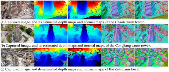 Based on the camera pose estimates and scene sparse representations produced by the incremental SfM procedure, multiple view stereo (MVS) [41] was performed, in which the depth and normal map of each rectified image was estimated from photometric [42] and geometric [43] consistency, and all of them were fused to generate dense models. An example of a captured image and its estimated depth maps and normal maps of each drum tower are shown in Figure 12, and the dense reconstruction results are shown in Figure 11. It could be observed from Figure 11 and Figure 12 that the camera poses are well estimated, the depth and normal maps are correctly computed, and the scene structures are properly recovered. All the above 3D reconstruction processes of the drum towers, including feature extraction and matching and 3D scene sparse and dense reconstruction, are conducted with the COLMAP toolbox with the default parameter setting.