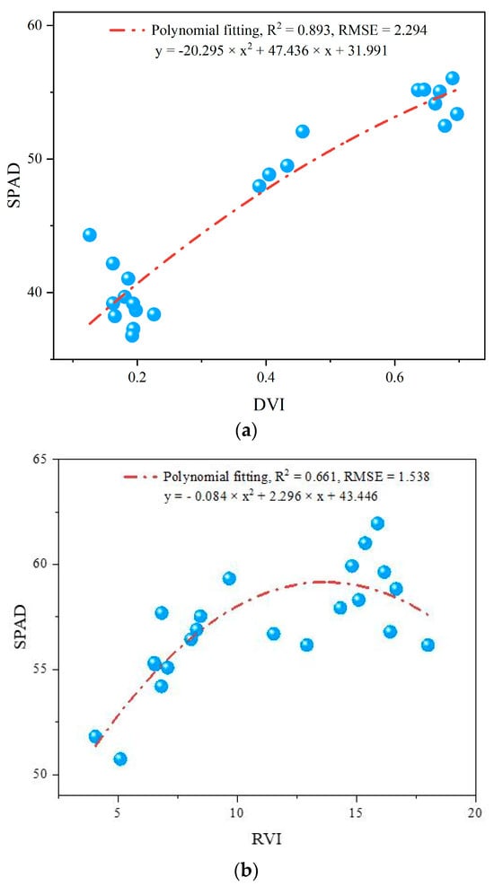 The SPAD inversion model results are shown in Figure 13a–c. From the results, it is evident that during the P1 period, the polynomial regression model of the DVI-SPAD model has the highest inversion accuracy, with an R2 of 0.893 and an RMSE of 2.294. During the P2 period, the SPAD inversion accuracy is not very satisfactory. The polynomial regression model of RVI-SPAD achieves the highest inversion accuracy, with an R2 of 0.661 and an RMSE of 1.538. In the winter wheat P3 period, the polynomial regression model of TCARI-SPAD shows the highest inversion accuracy, with an R2 of 0.831 and an RMSE of 5.476.