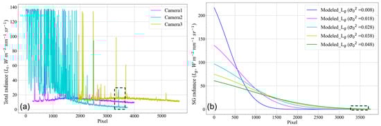 A continuous radiance profile is derived along the “Profile” line in Figure 7a–c, and these data are plotted in Figure 8a. Along the “Profile” in Figure 7b, we extract the geometric angle of each pixel. Then, we set five roughness values, i.e., = 0.008, 0.018, 0.028, 0.038, and 0.048. Using Equation (2), we simulate the SG radiance with different roughness values (Figure 8b). A portion of the image is enlarged to show the contrast between the radiance of the SG-free area image and the modelled SG radiance (Figure 8c,d). We can see that the radiance of the image in the SG-free region is about 3 to 5 () higher than the simulated one.