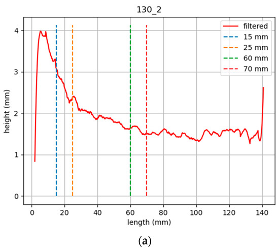 From the above introduced sequences, weld bead geometric parameters were computed following the measuring principle described in Section 2.1. This was based on tracking the projected shadows (via image processing) and calculating the displacement of the line with respect to the reference value (initial straight line). This difference in pixels was translated into millimeters according to Equation (1) (Section 2.1) and considered the parameters (k and θ) that needed to be calibrated beforehand. Finally, to obtain the geometric parameters from the extracted curves, height was computed as the maximum value of the curve while for width and contact angle, additional processing was required. Derivative of the curve had to be assessed in order to automatically determine where the edge of the weld bead was located. As there were two abrupt changes in the derivative curve corresponding to both sides of the weld, the distance between them was defined as the weld width. In addition, at this exact location, the tangent of the curve was calculated as a measure of the contact angle in each of the sides of the weld. As a result, graphs showing the evolution of the different geometrical parameters along the whole weld were obtained. Some of them are illustrated next. As an example, in the following graphs, the contact angle and height evolution are depicted for the high energy input sample. It has to be highlighted that the effect of the bump or accumulated material at the beginning is clearly reflected in the graphs (from 0 mm to 30 mm indicated by the red line) and values stabilized from moment one. Four transversal dashed lines were also included in the graph to indicate the location where weld cross-sections were analyzed for validation purposes.