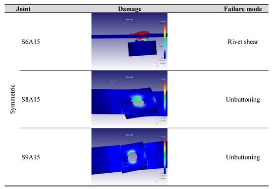 - Symmetrical joint S9A15: in this configuration, the results are similar to the previous ones, so the failure can be predicted as unbuttoning of the rivet.