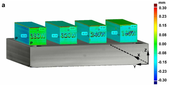 The high thermal gradients and cyclic thermal expansion/shrinkage, occurring in 18Ni-300 maraging steel parts printed using LPBF AM, are a source of plastic strains that can affect the distribution of internal stresses (also known as residual stresses) and result in distortions that may render the part out of tolerance with respect to the initial CAD geometry. Thus, the 4 rectangular prismatic-shaped coupons, still attached to the build plate after hybrid manufacturing (Figure 2a), were inspected using an ATOS Core Optical 3D scanning system to evaluate the distortions/deviations in their geometry relative to the CAD model using a best-fit algorithm. For the 4 coupons fabricated by hybrid manufacturing, Figure 3 describes the inspection results through a contour map with a color scale selected for the range of -0.3 mm to 0.3 mm in distortion/deviation. Overall, the deviations between the geometry of the coupons and the CAD model were higher for the as-printed surfaces (Figure 3a), ranging from about 30 μm to 160 μm. After machining, the deviations (Figure 3b) could be reduced to values between 10 μm and 110 μm, indicating high accuracy in the final geometry. It is noteworthy that the highest deviations were noticed for the as-printed surfaces built at 380 W, which was at the highest infill ED of 90.5 J/mm3 used in the present study. Previously, thermal simulation of the LPBF process has indicated high sensitivity of the part dimensions to the process parameters affecting the ED [40], which reasonably explains the current findings of lower dimensional precision/accuracy for the 380 W condition.