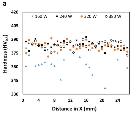 Two test methods were used to measure the hardness of the specimens: Rockwell and Vickers, according to ASTM standard specifications, as given in [37,38], respectively. To measure the bulk hardness, Rockwell testing was conducted using a diamond rounded-tip cone indenter (ground at 120°) with a diameter of 0.2 mm and a minor load of 10 kg, followed by a major load of 150 kg, in accordance with guidelines for the C-scale typically used for steels. At least 5 Rockwell C hardness (HRC) measurements were carried out for each specimen condition (160 W, 240 W, 320 W, and 380 W). Vickers microhardness (HV) measurements were performed on the specimens prepared with a polished (mirror finished) surface using a Struers DuraScan 80 hardness tester (Ballerup, Denmark) with a fully automatic cycle [39]. The reported Vickers hardness distribution across the specimen cross-sections was determined from the average of 3 measurements for each point with a load of 500 g, an indent spacing of 0.8 mm, and a dwell period of 15 s.
