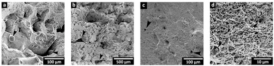 After static tensile testing, the fracture surfaces of select specimens at each power level were examined using SEM, as shown in Figure 10. For the 160 W condition, the fractured surface showed un-melted powder particles, within the large interconnected pores that were irregular in size (Figure 10a,b), as well as the lack of fusion regions between the layers (Figure 10b), which reasonably explains the early failure of the tensile specimens during mechanical property testing and the resulting low strength, ductility, and stiffness. By contrast, the fractographs of the 240 W (Figure 10c,d), 320 W (Figure 10e,f), and 380 W (Figure 10g,h) specimen conditions showed fractures exhibiting small rounded pores, which were remnant in the microstructure after LPBF processing, and the distinct formation of dimples on the fracture surfaces. These dimples are characteristic of a ductile failure mechanism that progresses through micro-void formation, growth, and coalescence, which eventually leads to micro-cracking and transgranular tearing through the material. Overall, no significant differences in the fracture surface features were observed between the 240 W and 320 W conditions, but the pores were slightly larger on the tensile surfaces of the 380 W condition.