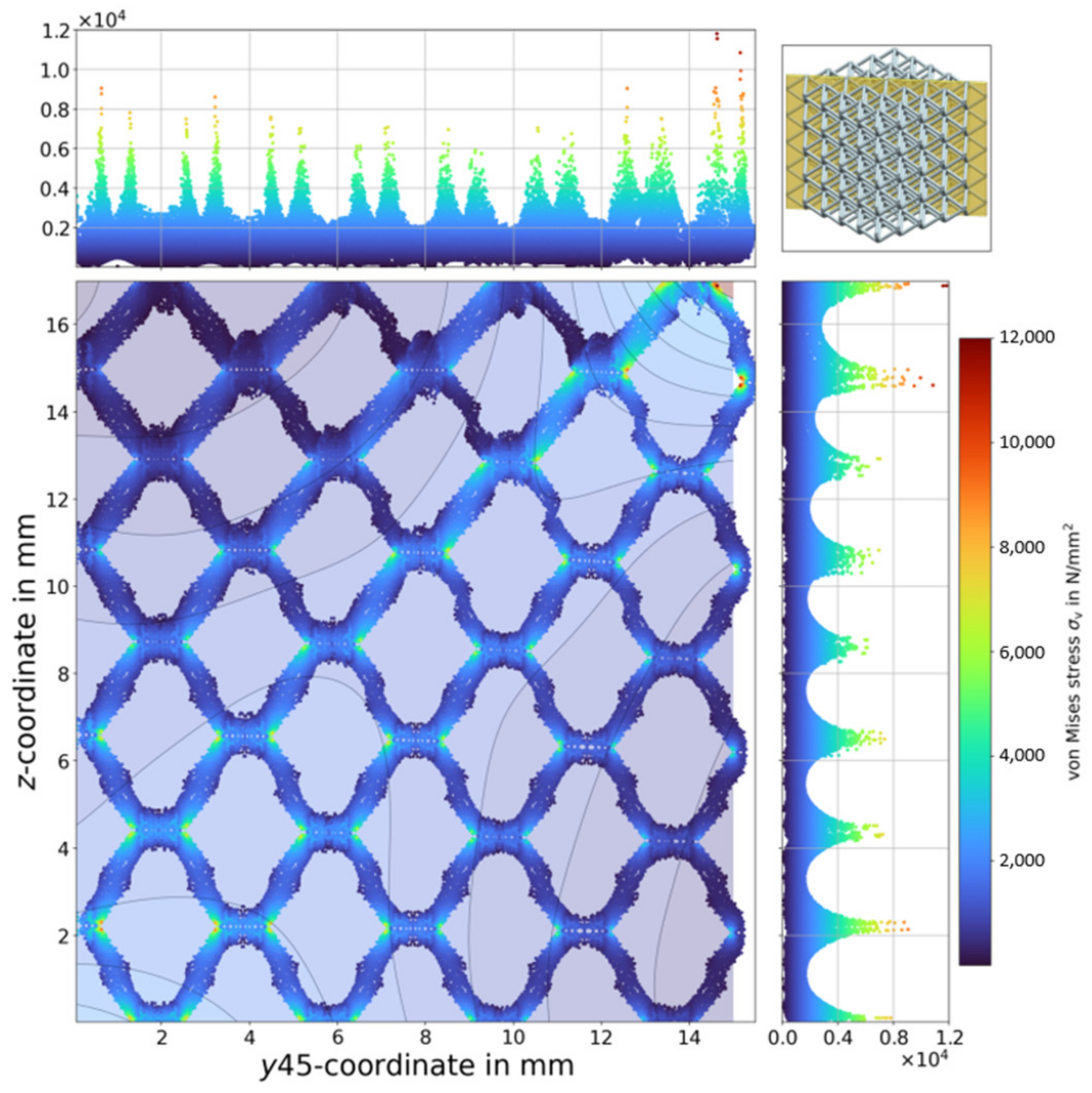 - Minimise the maximum von Mises stress in the top lattice region with the minimum von Mises stress constraint in the centre lattice region above the corresponding analytical yield stress of the considered unit cell [44].