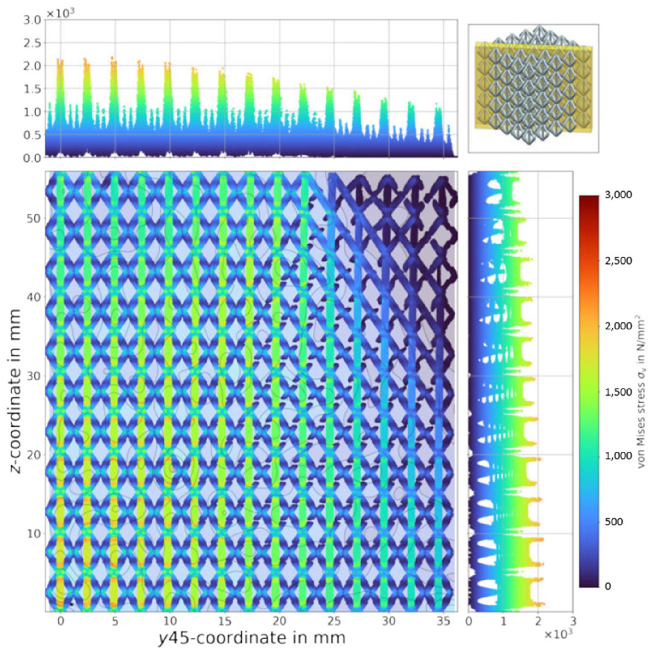 - Maximise the minimum von Mises stress in the lattice centre region with stress constraints for uniaxiality in the top lattice region and .