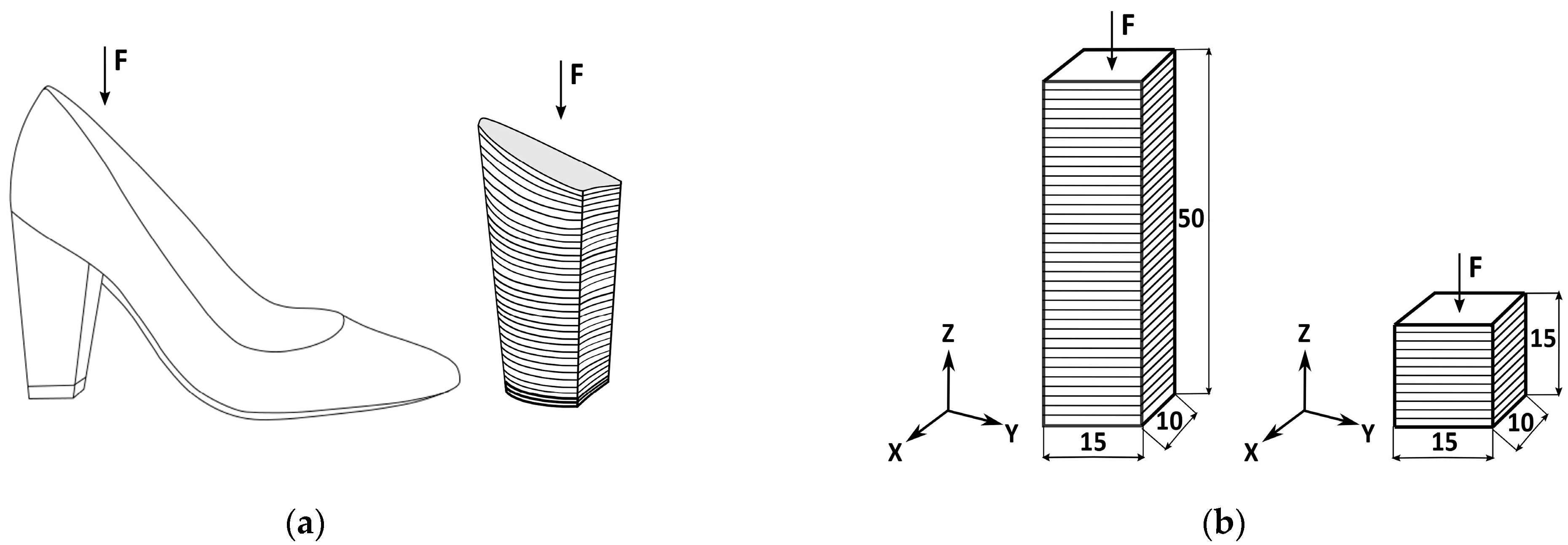 - Gelaziene, E.; Milasiene, D. Influence of the Type of Plastic and Printing Technologies on the Compressive Behavior of 3D-Printed Heel Prototypes. Materials 2023, 16, 1930. [Google Scholar] [CrossRef]