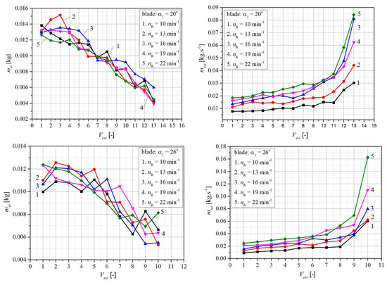 Figure 9a shows the course of the amount of extruded paste behind the die. For the blade with the angle , which is the longest, the samples were taken from 13 control volumes of . For blades with angles and , ten control volumes were provided. From these results, it is difficult to assess the effect of rotor speed with the blade on the amount of extruded material. However, it can be seen that the larger the angle, the greater the variance of the values. This is the absolute amount of extruded material, not the throughput dependent on the rotor speed. Figure 9b indirectly shows the throughput of the paste through the holes in the individual control volumes. The flow speed is hidden in the throughput of the extruder, i.e., the weight of the paste extruded through the holes of the matrix in control volumes per unit time. In this case, the effect of increasing the speed on the flow rate of the paste is evident. The throughput of the extruder increases with increasing blade angle and with increasing speed .