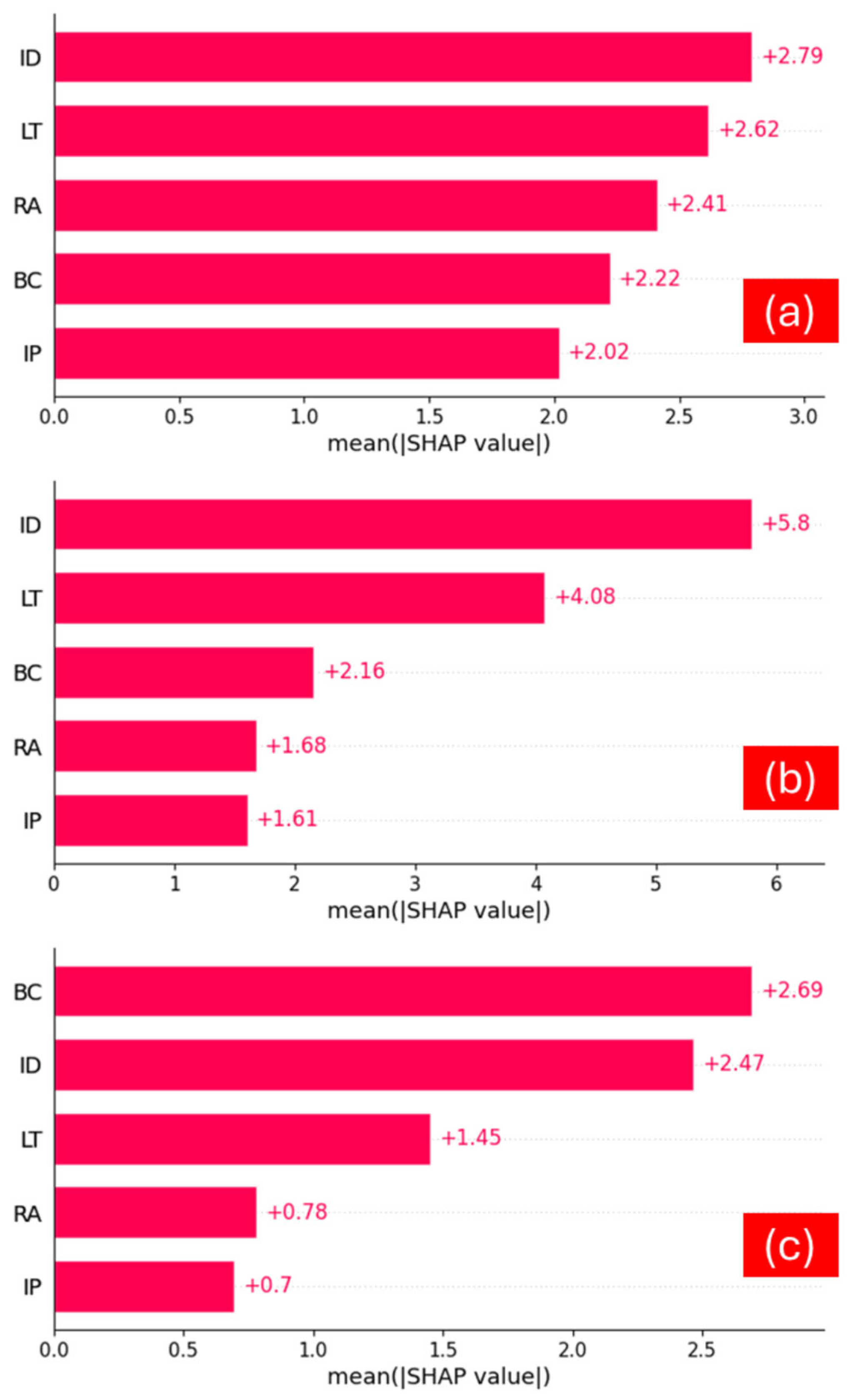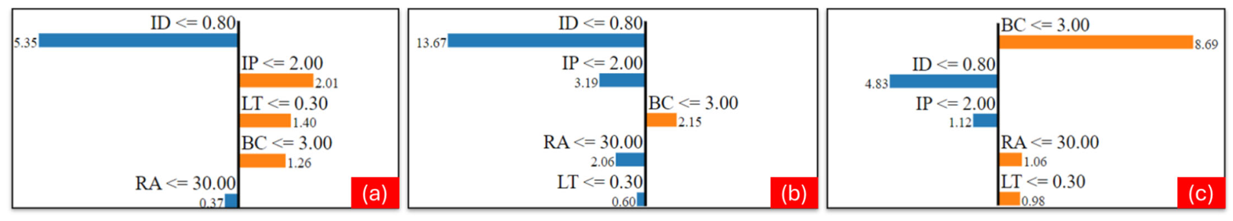 - For FS, LT > 0.30, BC ≤ 3.00, RA > 30.00, ID > 0.80 and IP > 2.00, a high positive LIME value is obtained.