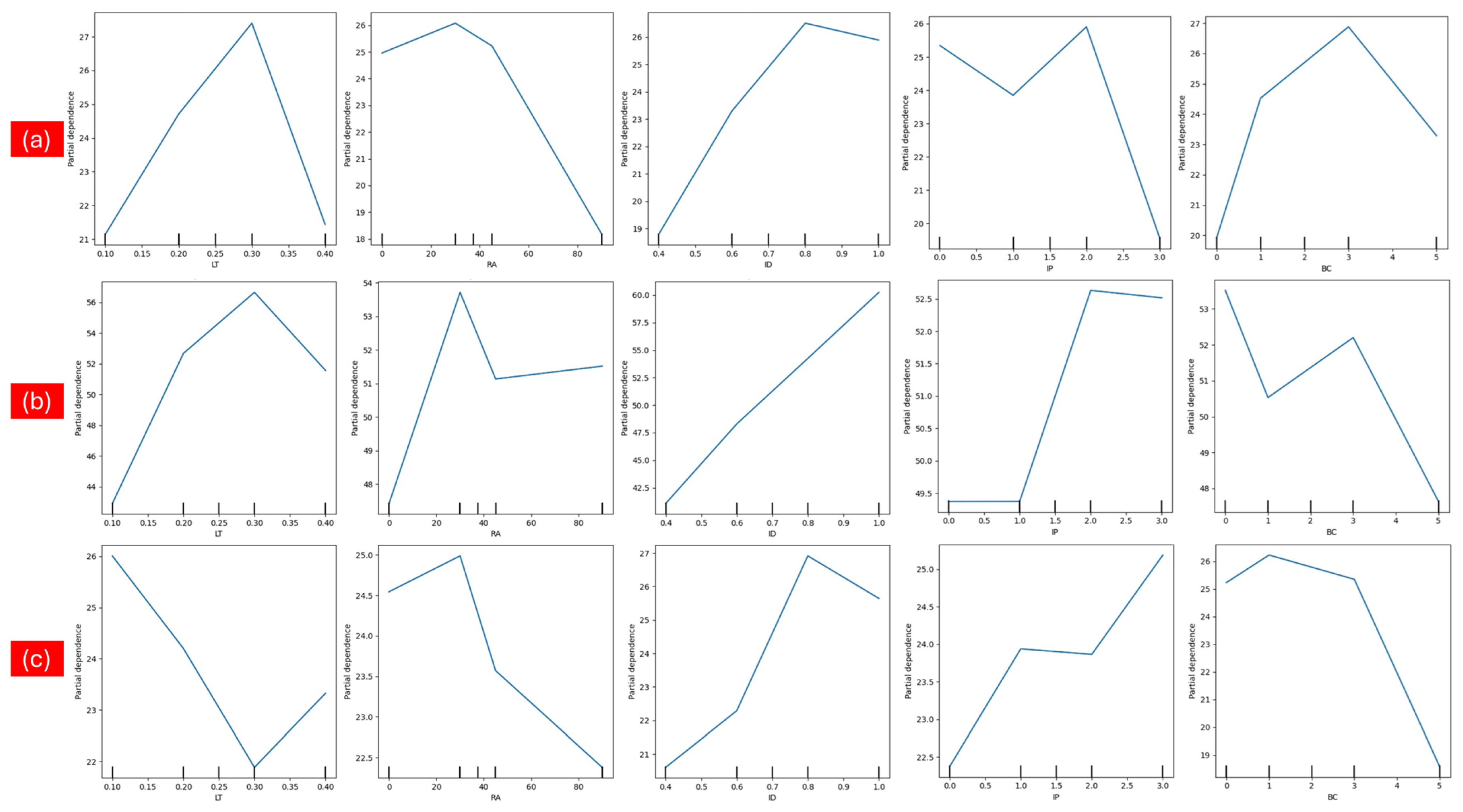 - BC: a lower biochar content (≤3.00) positively influences all three-strength metrics. A higher biochar content (>3.00) negatively impacts these strengths.