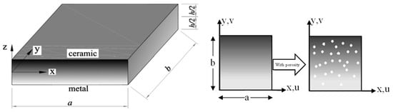 In the current work, we consider a thick rectangular plate of length , width and thickness , as illustrated in Figure 1, along with the Cartesian coordinate system centered at the mid-plane. With an FG variation of the Young’s modulus and density in the thickness direction in line with the following power-law distribution: