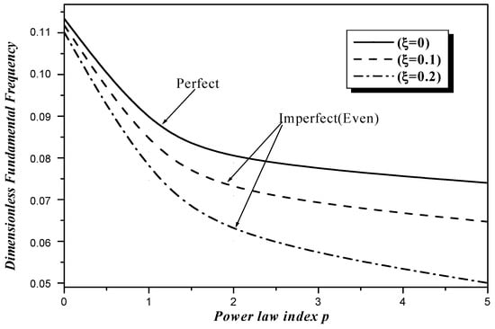 As is also visible in Figure 2, an increased material power index enables a monotonic reduction of the natural frequencies for both perfect and imperfect FG plates, which is even more pronounced for an increased porosity level, . In this case, we evaluate only the first vibration mode of the structure, accounting for both a perfect or imperfect structure with even distributions of porosities. As expected, a perfect structure features higher frequencies with respect to an imperfect one, under the same assumptions for the power law index .