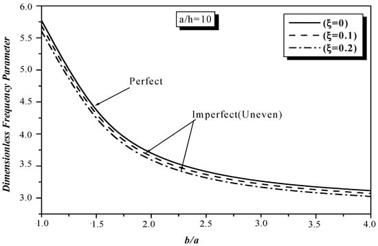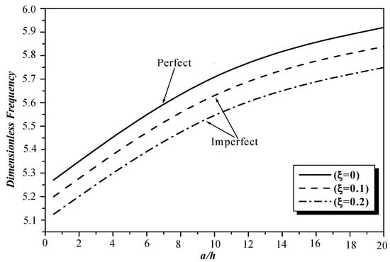 The dimensionless frequency vs. the thickness ratio for perfect and imperfect plates.