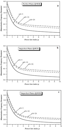 In Figure 4, we show the influence of the exponent and the thickness ratio, , on the dimensionless frequency for FG perfect () and imperfect ( and ) plates, with a monotone reduction in the frequency response for increasing values of , for a given geometry and porosity. Moreover, an increased ratio gets an increased dimensionless frequency for each fixed graduation level , as is also observable in the plots of Figure 5. This variation is more remarkable when for both perfect and imperfect structures, and it tends to reduce for thickness ratios higher than 10. In any case, the highest frequency values are expectable in perfect structures, whose predictions could overestimate the effective results of actual structures in the presence of dislocated defects. This confirms the importance of developing predictive models including possible defects or voids within materials, especially when featuring composite microstructural natures such as FG materials.