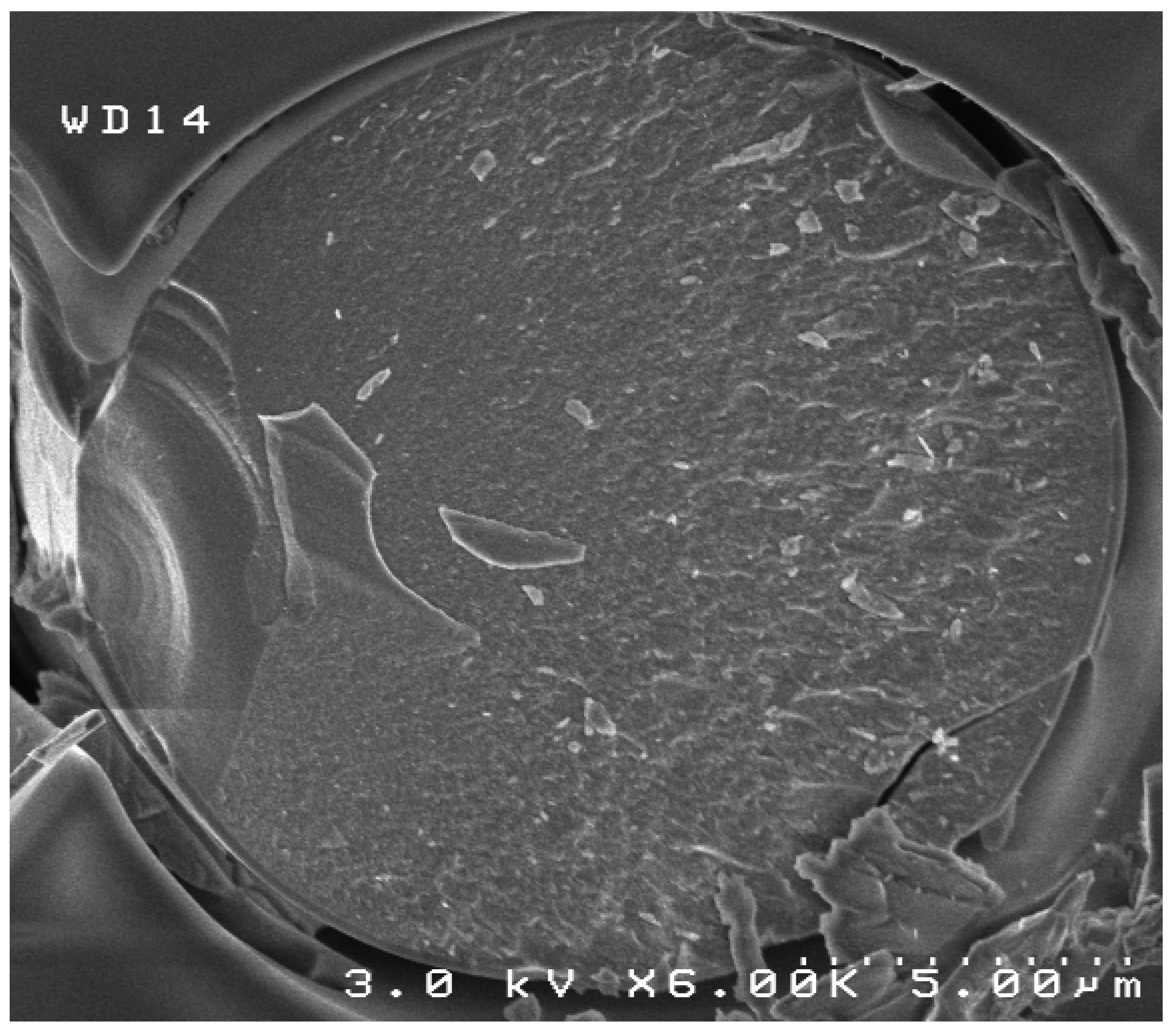 - Mirrors on the fractured surface of some filaments that are indicative of catastrophic fracture from flaws inherent in the filaments. From this it can be inferred that the stress operating on the filaments was sufficiently high, and much higher than the stress applied during the fatigue test (Figure 11).